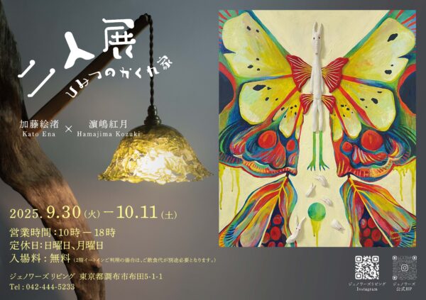 2025年9月30日から10月11日までの期間で、調布にあるジェノワーズリビングにて、工芸専攻4年生のガラス分野加藤絵渚さんと陶分野濵嶋紅月さんの展示が開催されます。